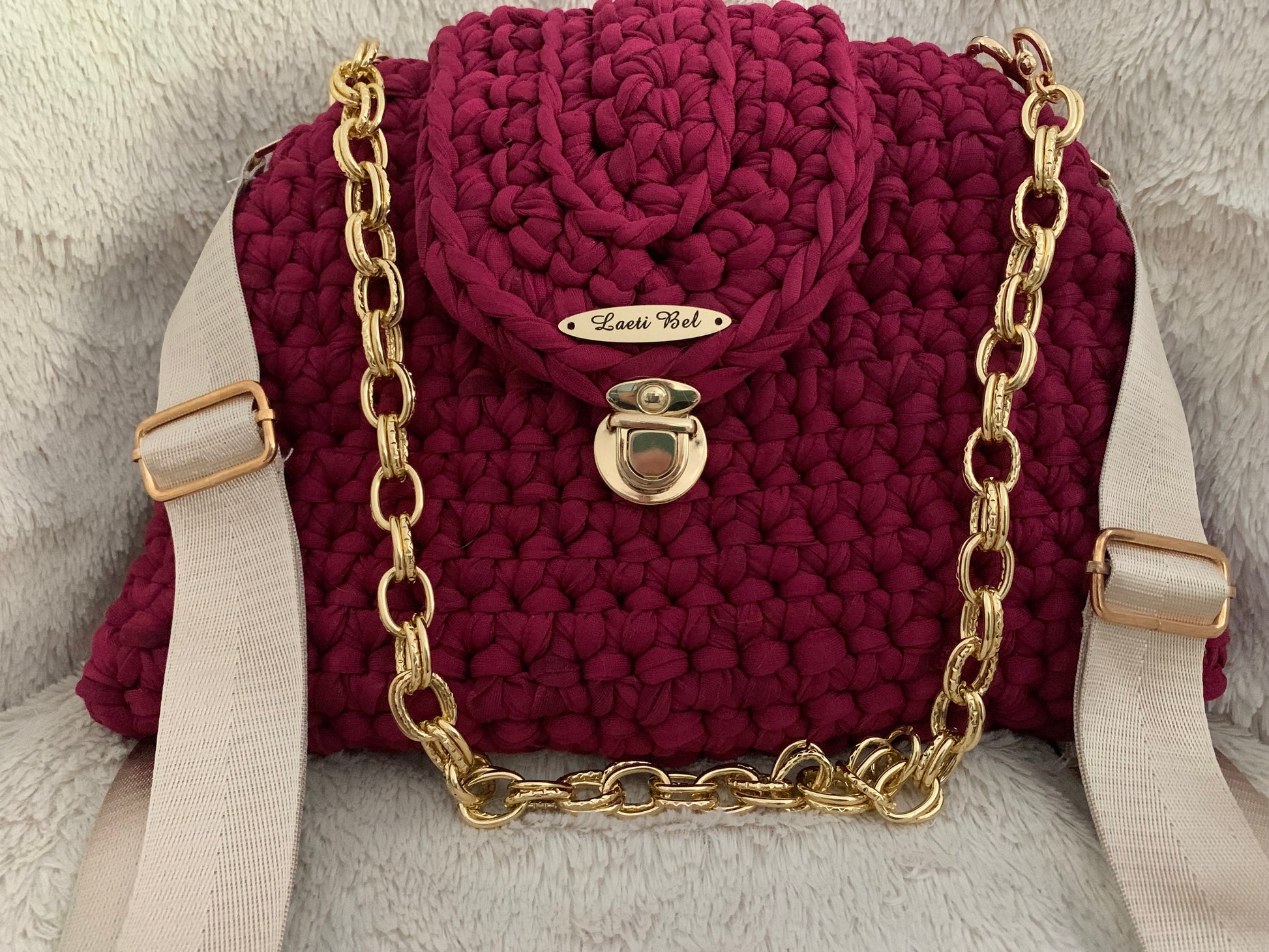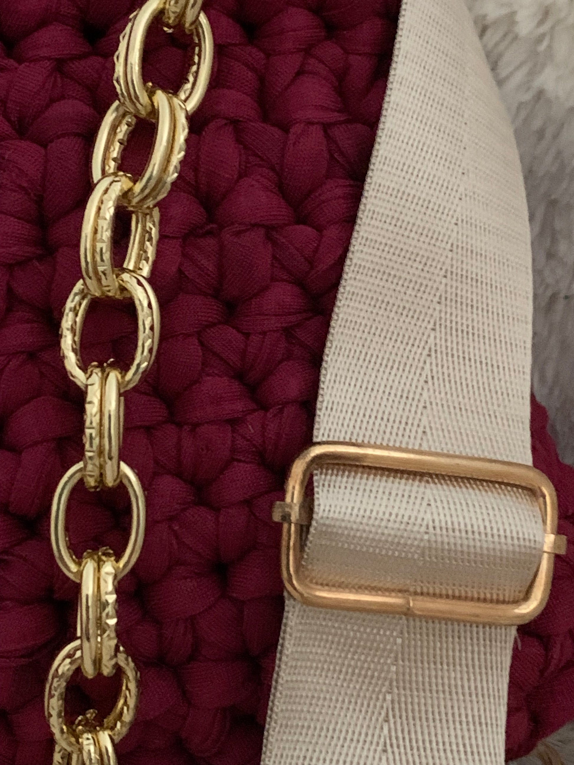 Le sac Nina séduit par son allure raffinée et artisanale. Réalisé en crochet bordeaux profond, il est sublimé par une chaîne dorée éclatante et des bretelles en tissu or qui ajoutent confort et contraste. Ce modèle est à la fois pratique et chic, parfait pour rehausser vos tenues.