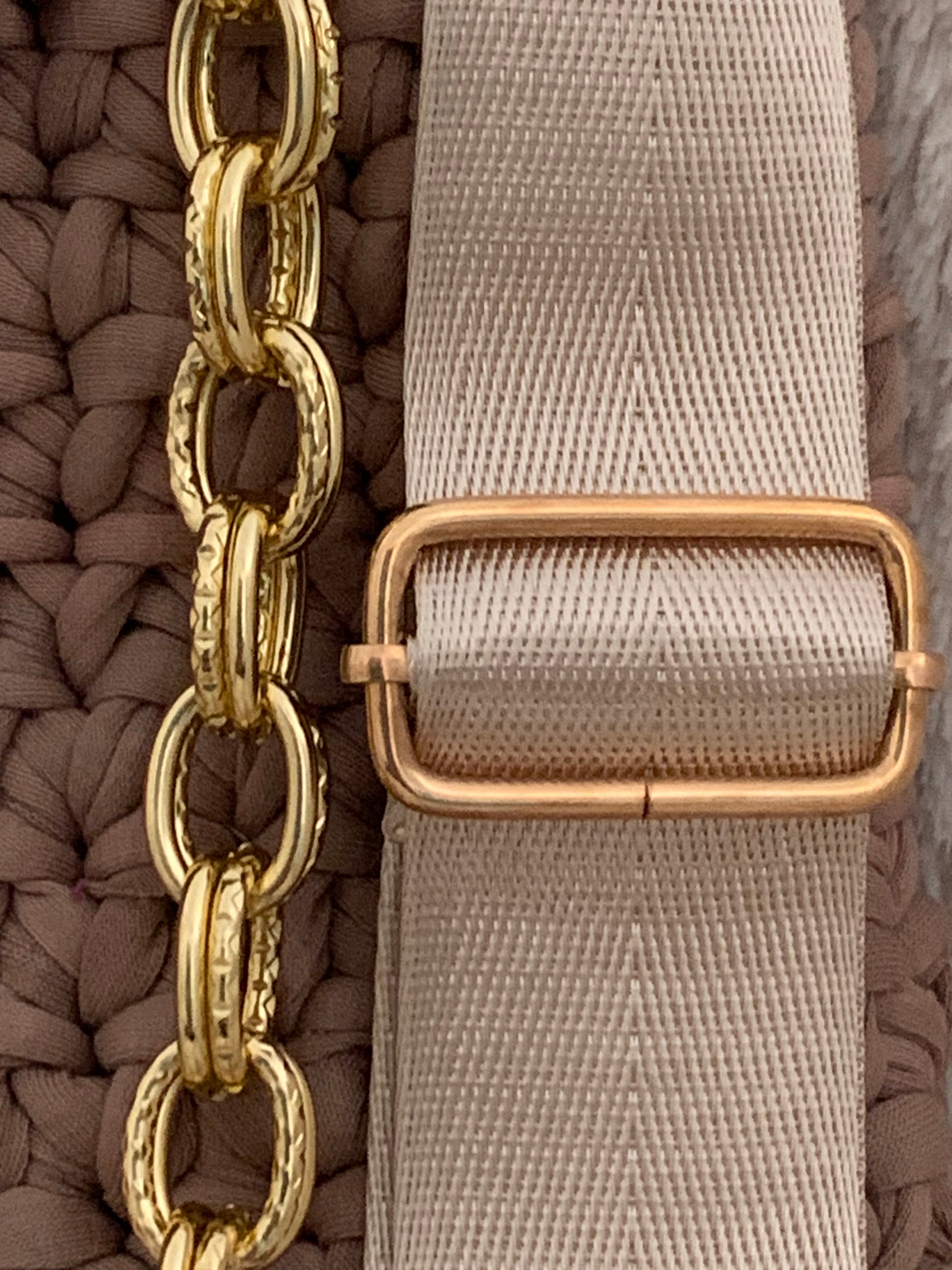 Anses : Bretelles réglables en tissu beige + chaîne dorée raffinée.