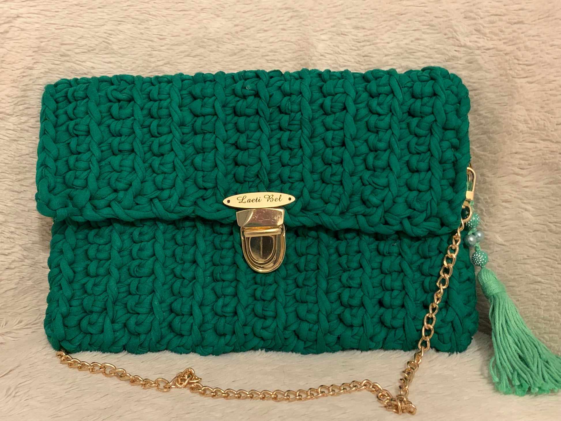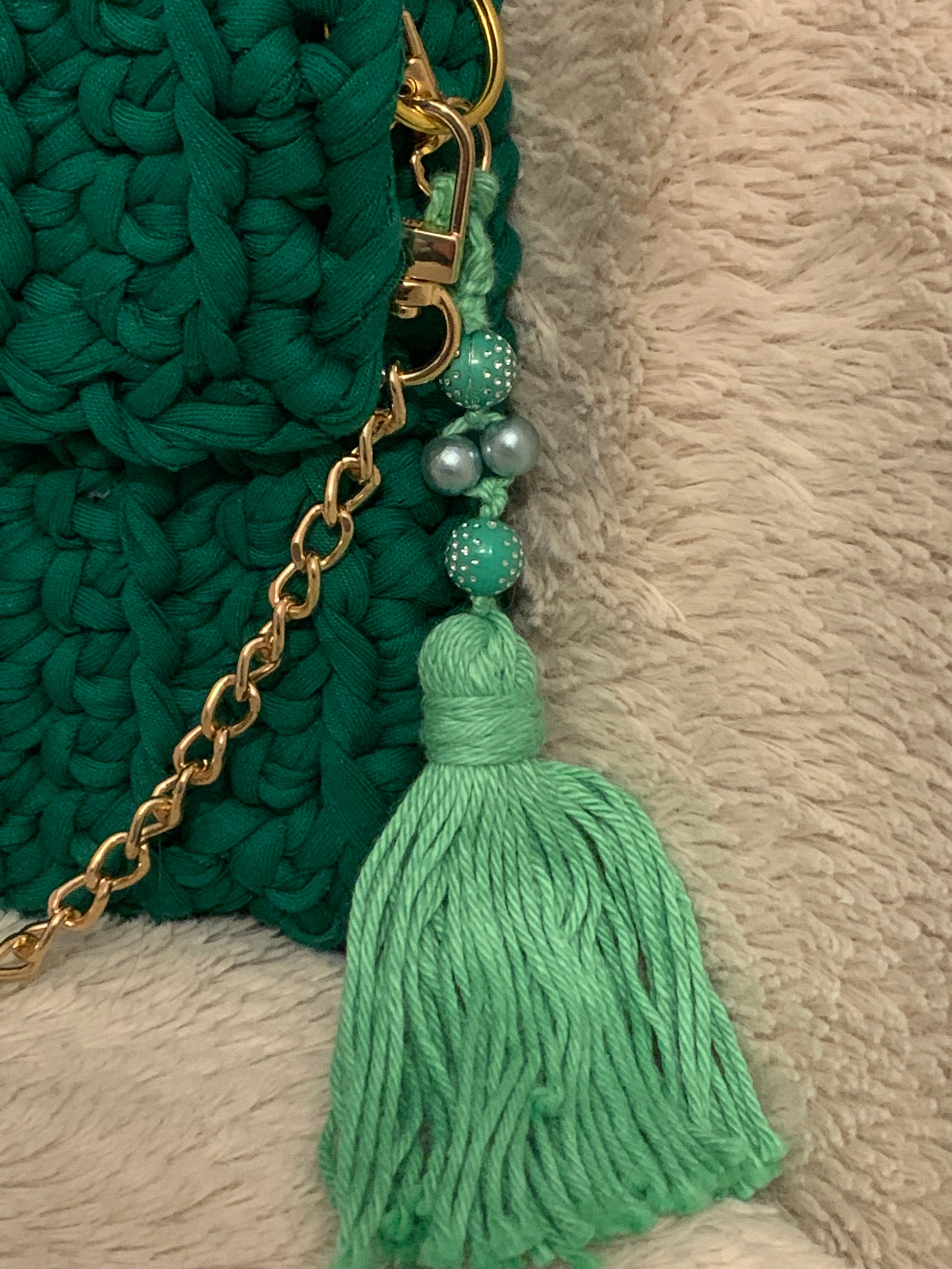 Le sac Pia en crochet artisanal arbore une magnifique teinte vert émeraude qui attire immédiatement le regard. Sa chaîne dorée délicate et ses détails raffinés lui donnent une allure chic et élégante. La touche finale : un pompon assorti agrémenté de perles, qui lui confère une note unique et sophistiquée.