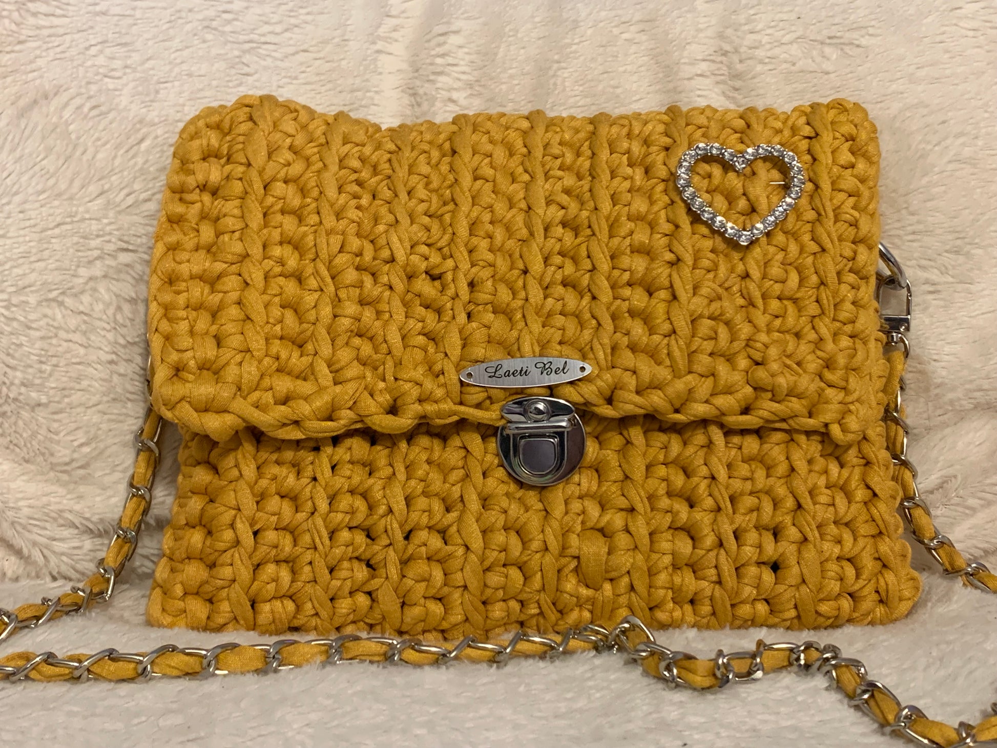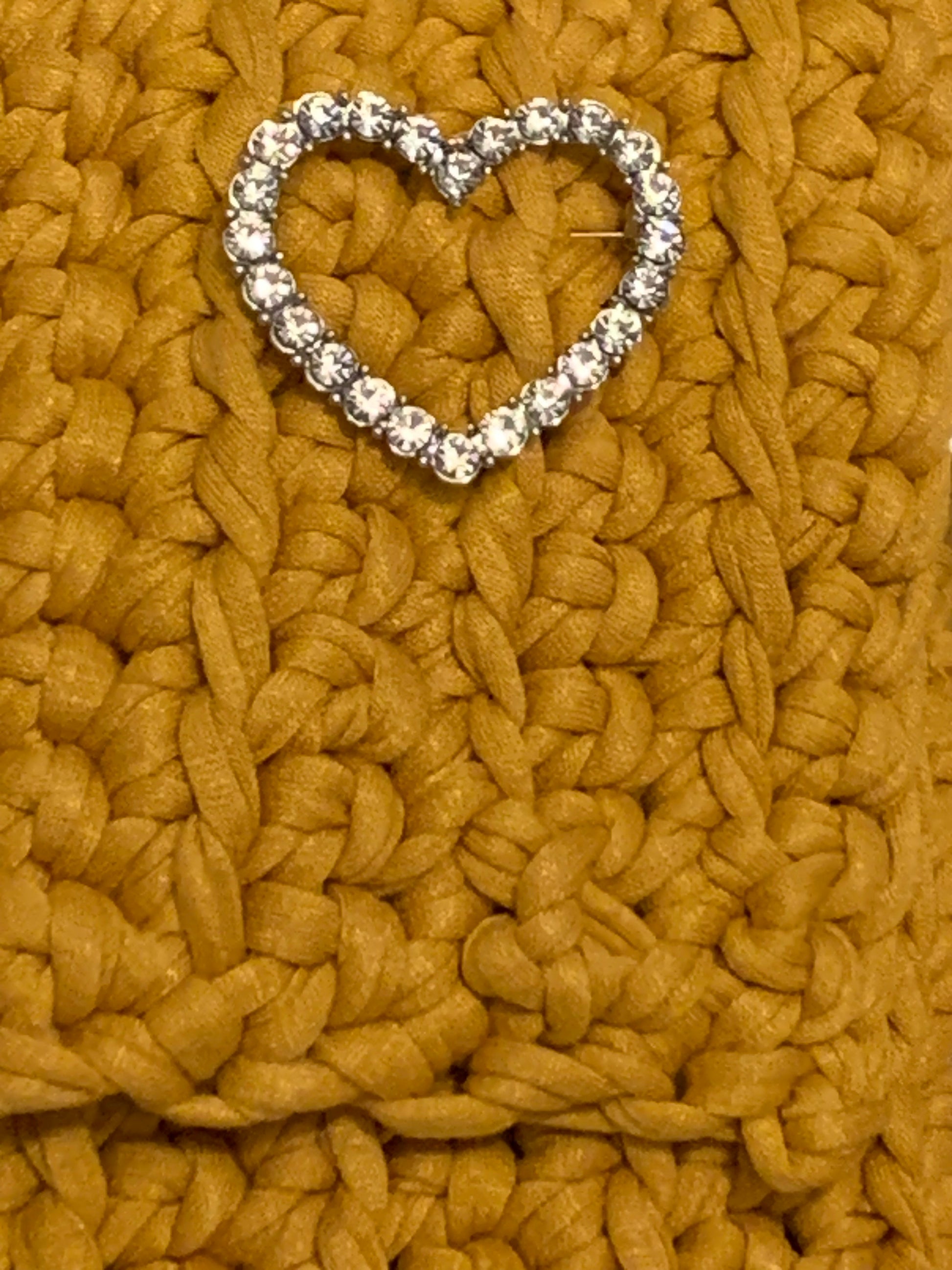 Le sac Pia en crochet jaune moutarde est l’accessoire idéal pour illuminer vos tenues avec style et originalité. Sa couleur chaleureuse et tendance apporte une touche de dynamisme, parfaite pour toutes les saisons. La chaîne argentée tressée de tissu assorti et le fermoir métallique argenté ajoutent une finition moderne et élégante. Le bijou en forme de cœur strassé vient sublimer le tout avec une touche romantique et raffinée.