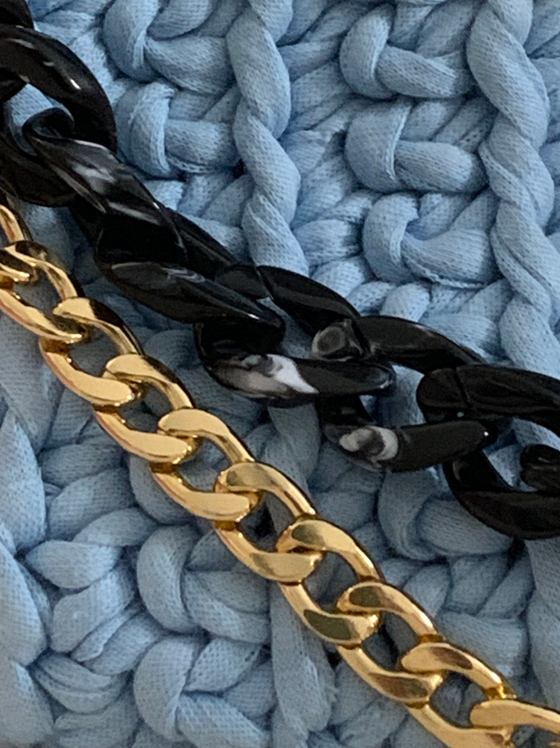 Matériaux : Tissu au crochet fait main, fermoir métallique doré, bandoulière chaîne dorée et noire.
